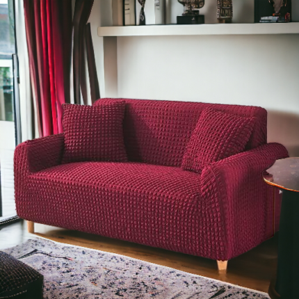 Bubble Stuff Fitted Sofa Cover | Maroon Color | sofa Slipcover, Modern Ruffle Trim Stretchy Stretch Sofa Slipcover For Home